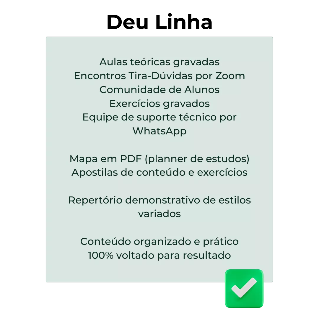 Como você pode ter percebido, o Deu Linha não é um curso voltado para iniciantes. O ideal é que você já tenha uma base antes de começar os estudos conosco. No entanto, para garantir que você esteja preparado para acompanhar as aulas, faremos uma revisão dos conceitos essenciais, como intervalos e escalas, no Módulo Start. Dessa forma, você terá todos os conhecimentos necessários para aproveitar ao máximo o curso.